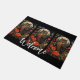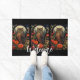 A welcome doormat with a cool looking owl with a piercing stare. A full moon in the back with a garden of red flowers.