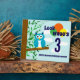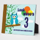 Look whoo's having a birthday! Fun blue owl in a woodland scene with blue sky and fluffy clouds