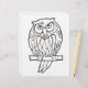 Colouring book page. Owl cartoon sitting on a branch looking at front.