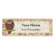 Cartoon illustration of owl sitting on tree branch on beige seamless leaves backgound. Custom text fields for name and occupation.