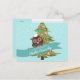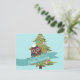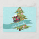Cute owl wearing a chef's hat and holding a wooden spoon, with cookie tree background and polka dots snow on this Christmas holiday recipe card.