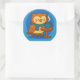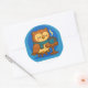 A glossy, vibrant round sticker featuring a cozy cartoon owl enjoying a steaming cup of coffee at a café table, set against a bold blue background. With kawaii styling, warm details, and crisp contrast, this design is perfect for planners, laptops, water bottles, and anyone who loves cute animals and coffee culture.