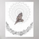 Graceful grey owl swoops across a wintry landscape, with a mandala moon shining behind her. Perfect for owl lovers, bird lovers, and anyone who finds the sacred in nature. Original acrylic and ink canvas by Deerhawk.