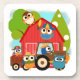 Our Owl Farmers T-shirts, mugs, bags, cards, pacifiers, stickers, key chains, keepsakes, wall clocks, and other items are so cute and colourful, a new spin on farming! Features a big red hay barn, trees, a tractor with a wagon full of red tomatoes, and owls with corn, pitch forks, and carrots!