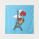 An illustration of a cute kawaii cartoon owl wearing a red french basque beret and flying with red heart ballons on blue sky with clouds passing on the tower in Paris France on the day of love. This adorable bird design is a gift idea for city lovers, animal lovers and valentine's day lovers.