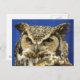A beautiful brown and white feathered wild owl, most likely the Great Horned Owl variety. Large yellow eyes, sharp beak and feather details are all captured in this close up colour photograph.