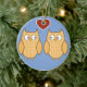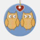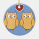 design of two owls standing together with a red love heart between them on a sky blue background. Cute and quirky cartoon design inspired by love and friendship.