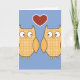 design of two owls standing together with a red love heart between them on a sky blue background. Cute and quirky cartoon design inspired by love and friendship.