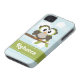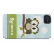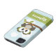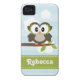 Personalise this cute and stylish custom owl iPhone 4 and iPhone 4s Barely There Case-Mate cover with your name on the lime green contrast stitch ribbon design. An adorable wide eyed owl sits perched on a leafy branch against a fluffy cloud and horizontal blue striped background. This universal case fits the iPhone 4/4s Verizon, Sprint and AT&T phones. Artwork © Chrissy H. Studios, LLC. All Rights Reserved.