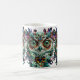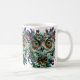 Vibrant and mystical depiction of an owl. The owl is perched on a branch, surrounded by a cosmic, colourful backdrop. Its large, bright orange eyes stand out, and the owl's feathers are intricately patterned with layers of blue, purple, green, and orange hues, giving it a mesmerizing and otherworldly appearance. The background has a swirling, psychedelic feel with celestial elements like stars, planets, and glowing orbs, creating a sense of mystery and magic. The overall style is highly detailed, with a mix of fantasy and surrealism, evoking both wisdom and enchantment.