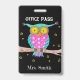 A faux chalkboard hall pass with an owl with huge flowery and beautiful eyes . Personalize it with a name and type of badge you want (hall pass , student pass , office pass , library pass , etc) I avoid adding a room number and school name to give the opportunity to teachers to take their passes with them when they have to relocate to a different school . It save them a few bucks :)