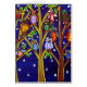 Fun and whimsical folk art style grouping of multi coloured Owls, having a party under the stars.