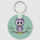 Basic Button Keychain has a cute purple cartoon owl on a limb with a green polka dot pattern background. Customisable.