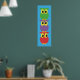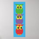 3 cute owls on a blue background. Slim, vertical. Fits in the narrow space between things. Hand drawn owls with 2 of them sitting on top forming a stack of cute owls. byEML