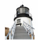 A unique perspective looking up at the lighthouse from the bottom of the stairs leading to it. Th white and black lighthouse stands out from the blue Sky's behind behind it and light brown color of the early spring grass. A perfect addition to any lighthouse lovers collection.