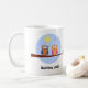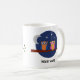 A mug with two sides each depicting a pair of cute owls perched on the branch of a tree. At night they are wide awake, the sky is dark and there is a crescent moon and stars. During the day they are fast asleep and the sun shines in the light sky. The caption is "Night owls" and "Daytime owls", or you can enter your own text by typing in the boxes.