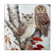 Digital image of two owls in a white Birch Tree with red and orange Fall leaves.