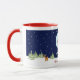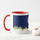 This mug has a vector illustration design with cute baby owls, wearing an oversized Santa hat and Christmas scarfs, in a snowy full moon night. You will find Rudolf and Christmas trees below. The text Merry Christmas is a template object and can be changed easily into any other text.