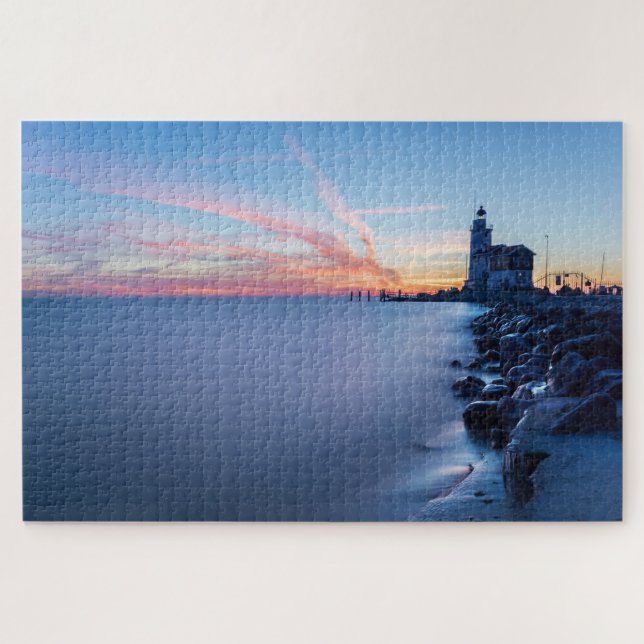 Jigsaw puzzle with the Paard van Marken lighthouse during a blue sunrise on a very cold winter morning with ice on the wavebreaker rocks and motion blurred water of IJsselmeer lake on Marken Island, the Netherlands, creating a very moody atmosphere.
