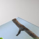 A single white Pacific dogwood blossom with a green centre is the focal point of the image, delicately perched on a thin branch. The blossom is partially open, revealing its delicate petals and the green centre. The branch is adorned with several green leaves, adding a touch of vibrancy to the composition. The background is a soft blur of green and blue, suggesting a tranquil water scene.