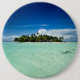 Button with a desert or uninhabited adventure Island with palm trees and a dark blue sky in the turquoise water of a lagoon in the Pacific archipelago French Polynesia