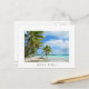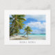 Postcard with a hanging palm tree on a white sand beach on a small desert island in the blue lagoon of tropical Rangiroa, an atoll near Bora Bora in the Tahiti archipelago French Polynesia in the Pacific ocean with the text 'Bora Bora' in a white border.