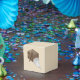 A cartoon of an old man cardboard box with a white beard and moustache. The box has dust, dings, sun fading, water damage, bends, marker, everything that makes him look old. He also has a cane with a curved top leaning against him. A very distinguished-looking box.