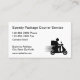 This package delivery courier service business card design template is created with a motor scooter delivery guy in the background and classic business card layout that can be customised online. Alternatively works as a food delivery service contact card.