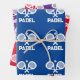 Padel racket Christmas wrapping paper sheets. Fun custom colour gift wrap for Christmas, Birthday and more. Blue red and pruple example. Cheerful pattern design for padel lover, tennis player, fan, friends, family, sports coach, kids etc. Happy Holidays! Personalise with your own name.