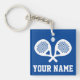 Square Padel tennis player keychain with custom name or monogram. Add your own personalised text and colours. Monogrammed plastic key chains gift with crossed paddle rackets and ball. Cool gifts for men, women and kids. Sporty bold typography template with blue background. Also great for pop tennis players.