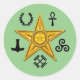 The star's middle symbol is a pentagram, outside symbols include other Pagan ways : Celtic, Egyptian, Roman, Slavic, Germanic on green background