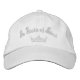 Shown in white with a embroidered stich colour of light silver blue text and the palest of silver-blue isacord tiara-crown. This cap has front text only shown with your title. Adjustable back.