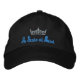Shown in Black cap with the embroidered text in blue and crown in silver Isacord. This cap has front text only. Adjustable back.