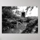 Black and white photography of a Japanese pagoda rising above a beautiful garden with a pond. The scene is at Toji Temple in Kyoto, Japan. The pagoda is a symbol of Kyoto.