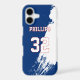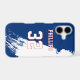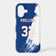 Add a name and number(s) to personalize this custom white paint splash design, red, and blue sports jersey inspired phone case. It is an excellent gift for a sports fan or athlete.