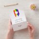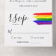 Charming all in one lgbt wedding invitation with rainbow pride flag drawn with messy strokes and adorned with a white heart against a white background.