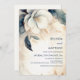This elegant minimal wedding invitation features 3D faux relief white flower with a shadow on a tan background. First names only text template