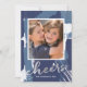 Spread cheer in the New Year with this modern holiday photo card featuring "cheers" in hand drawn script on an abstract painted background in faux silver foil and shades of blue. Photography © Storytree Studios, Stanford, CA