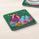 Pretty holiday coasters: painted Christmas presents, on a dark Christmas green background. #HostessGift