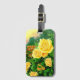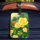 Bright yellow tea roses climbing up a brick wall with red roses in the distance.