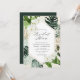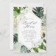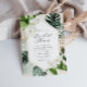 black script lettering and white watercolor flowers and greenery palm leaves.