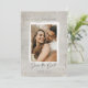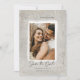The front of the card is beautifully designed, with a large space for your chosen photo, allowing you to share a meaningful moment with your guests. The photo is framed by a subtle painted grey background that creates a soft and inviting look, while the faux gold sparkles add a luxurious touch, ensuring your save the date stands out.