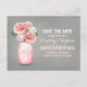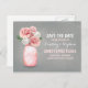 Lovely, adorable painted mason jar with pink / white flowers save the date postcard. Simply cute and fun distressed painted mason jar wedding stationary - vintage yet modern mason jar save the date postcards.