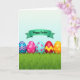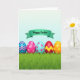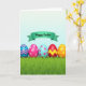 This design shows a spring scene with five decorated egg shapes lined up across the lower part of the card, sitting on a rich green patch of grass with a softly blurred edge in front 🌷. Each egg has its own pattern, like blue and pink zigzags, small pink flower clusters on a rosy background, and similar blossoms on a calm sky-blue base. Another egg is deep red with a bright yellow zigzag running across it, and the last one is orange with sunny yellow dots, giving the row a friendly, together-at-the-park feel 🐰. Above the eggs, a teal banner stretches across the upper area, adding a gentle curve that feels like an embrace over the group. The main greeting text sits centered on that banner in a dark ink tone, styled with flowing letterforms that look soft and romantic. Behind everything, the sky fades from pale to slightly deeper pastel blue, making the colors stand out without feeling harsh. The grass shows fine blades and light texture while the eggs look smooth and glossy, with the banner floating just above them.