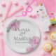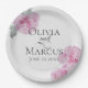 Wedding Paper Party Plates | Painted pink peonies with light green rose leaves on a background of faux eggshell rice paper texture - A combination of script calligraphy combined with a minimalist, contemporary style text layout makes it a trending style wedding suite. Design created for TheBarefootBride™ by © WhimsicalArtwork™. This is part of a wedding stationery suite collection with matching wedding accessories also baby shower and other occasion stationery. Feel free to contact us if you need assistance.