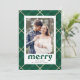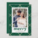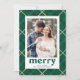 Spread holiday cheer to family and friends with our Painted Plaid holiday photo card. The modern holiday card features your favourite vertical photo framed in white with a background of painted green plaid with faux gold foil lines. The word "merry" is displayed in a green retro-inspired font with your greeting and name below. The modern holiday card reverses to feature two additional photos and your custom message in white with a dark green background. Designed to coordinate with our Painted Plaid holiday collection.