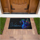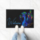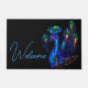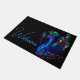 Bright blue body with colourful feathers against black creates a single funky bird.