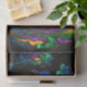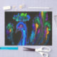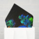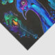 Bright blue body with colourful feathers against black creates a single funky bird.