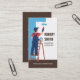 An illustration of a painter in red top and denim blue overalls standing on a ladder and painting blue on the wall with a roller brush. Perfect for those providing painting services! Personalise easily with your business details in the text templates provided. Business card in vertical alignment.