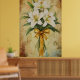 Painting of a bouquet of white lilies with a gold poster